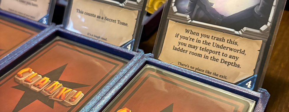Alcune carte possono poi generare “rumore” (Clank!): questo è rappresentato da cubetti del proprio colore che finiranno in una borsa comune e potranno essere estratti in determinati momenti, diventando danni al proprio personaggio. Più si rimane nel dungeon e più azioni si compiono, dunque, più rumore si fa, e potenzialmente, più danni si subiscono. Subire troppi danni può portare alla prematura dipartita e alla totalizzazione di ben 0 punti tondi tondi.