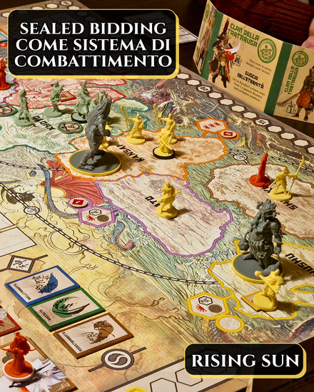 Esistono poi forme meno evidenti di bidding, disseminate nei giochi preferiti dal pubblico moderno. In Rising Sun, ad esempio, il combattimento stesso è risolto tramite offerte segrete, simultanee e non rilanciabili (=Sealed Bidding): risorse militari limitate vengono allocate senza informazione completa, e l’esito dipende interamente dal confronto tra le scelte dei due giocatori coinvolti.